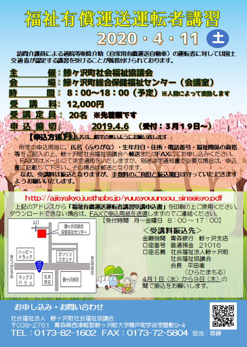 | 3月11日 | 平成31年4月13日(土)に「福祉有償運送運転者講習」を開催します。 開催要項や申込方法についてはこちらをご覧ください。【申請書】 |